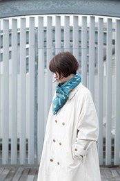 イラストレーターでテキスタイルデザイナーのムラタトモコさんとコラボレーションしたHayachine Madeの定番のパッカブルダウンマフラーです。